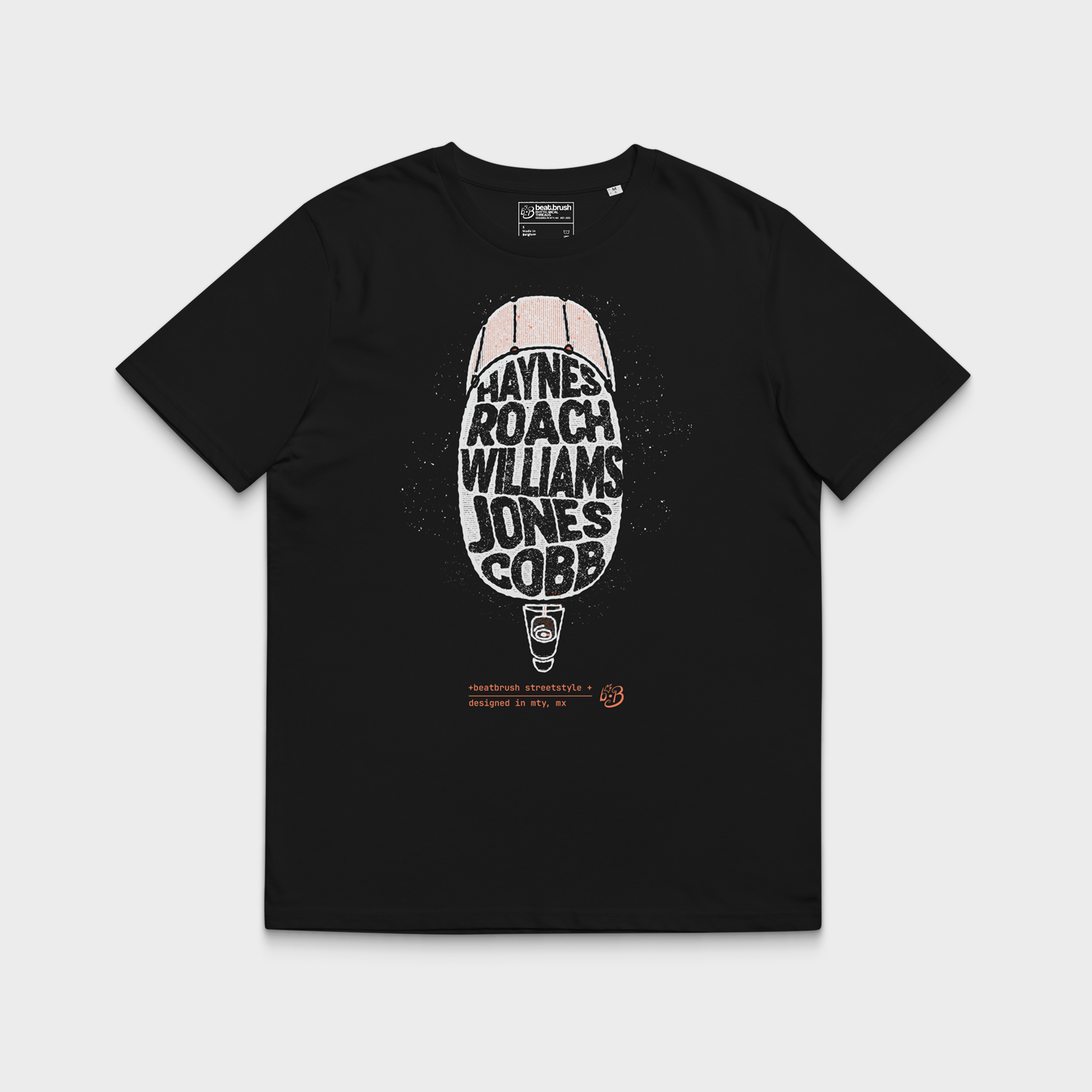 Classic Drums Heroes Tee — Jazz Legend Tribute Shirt (Haynes / Roach / Williams / Jones / Cobb)